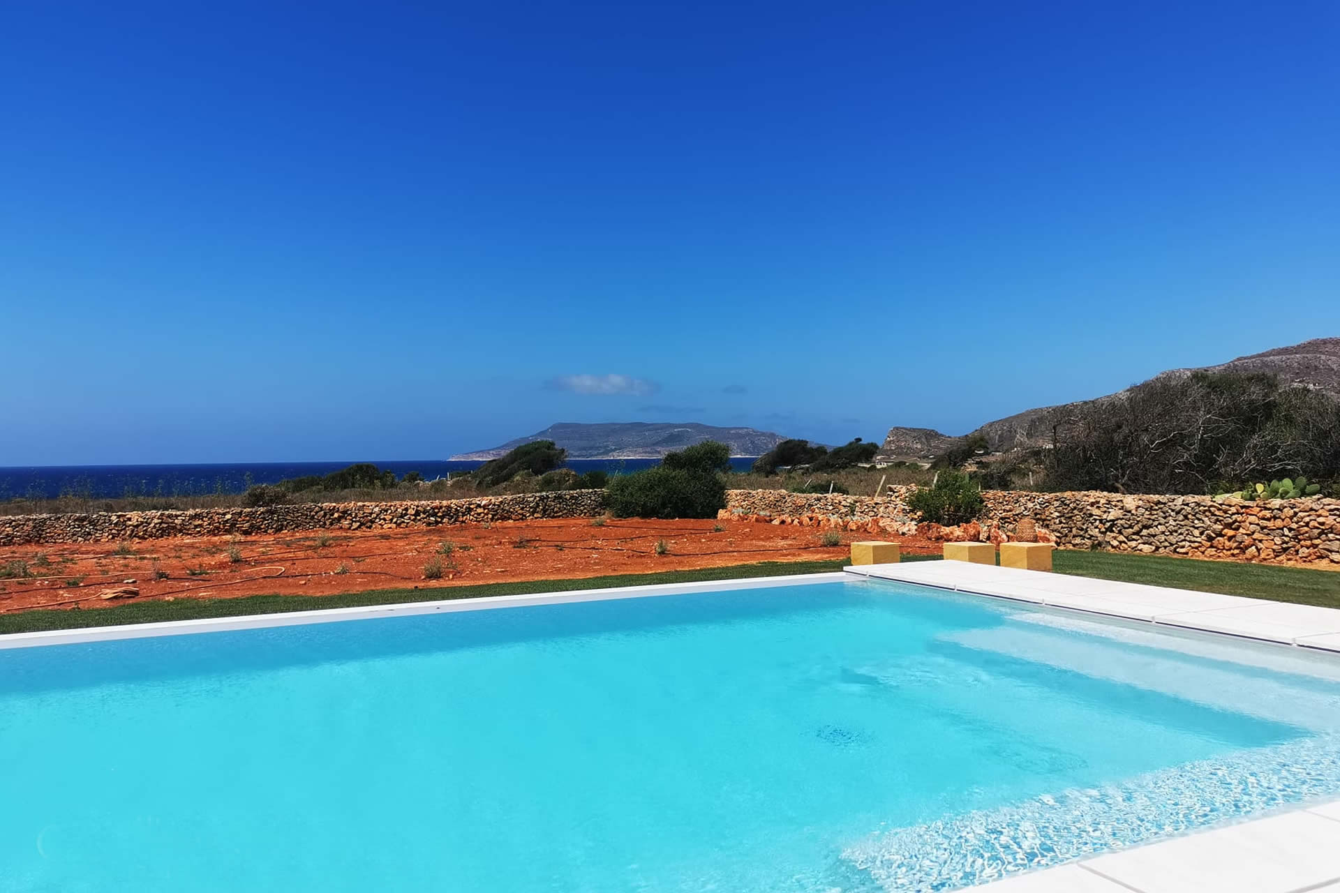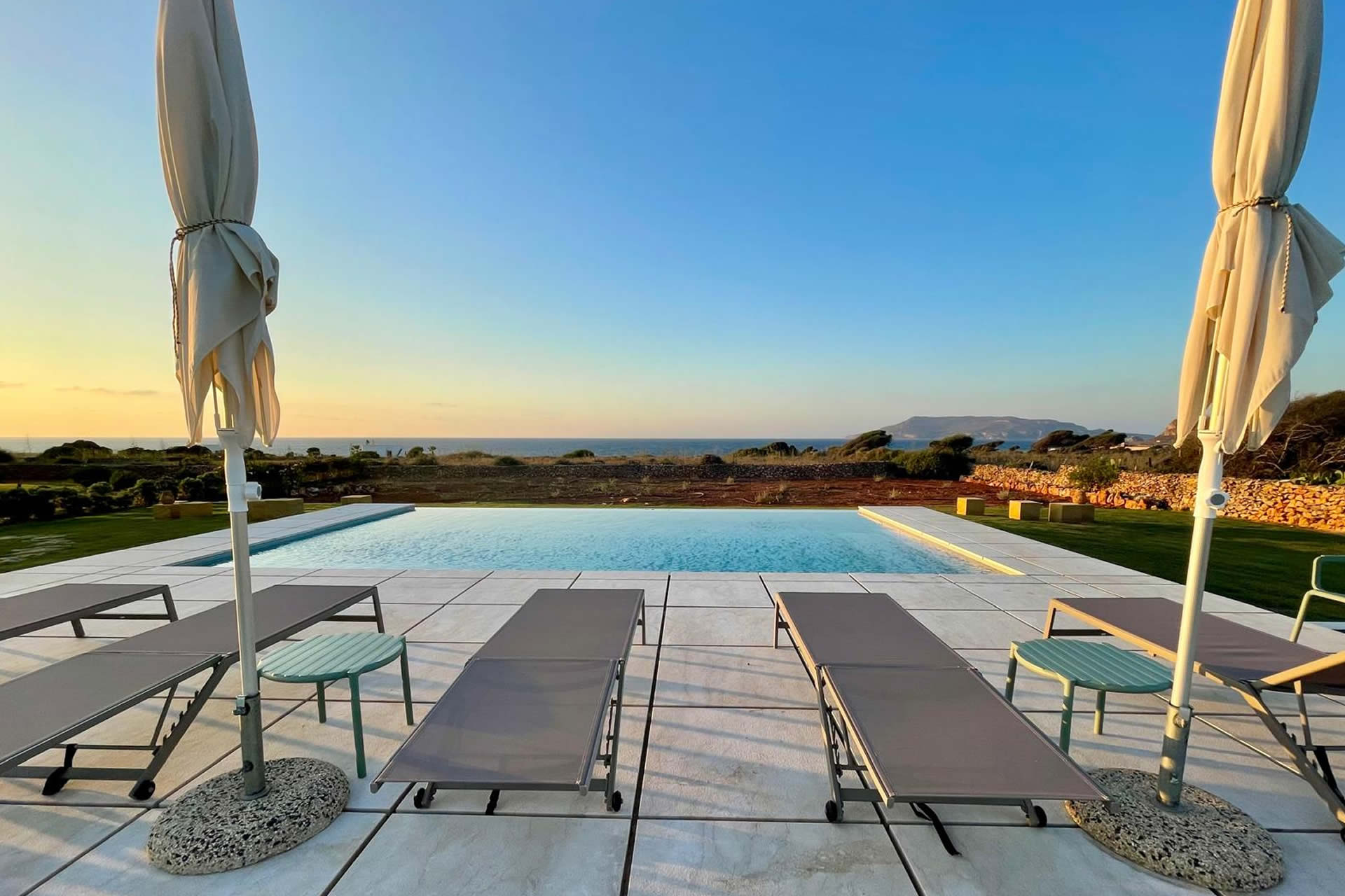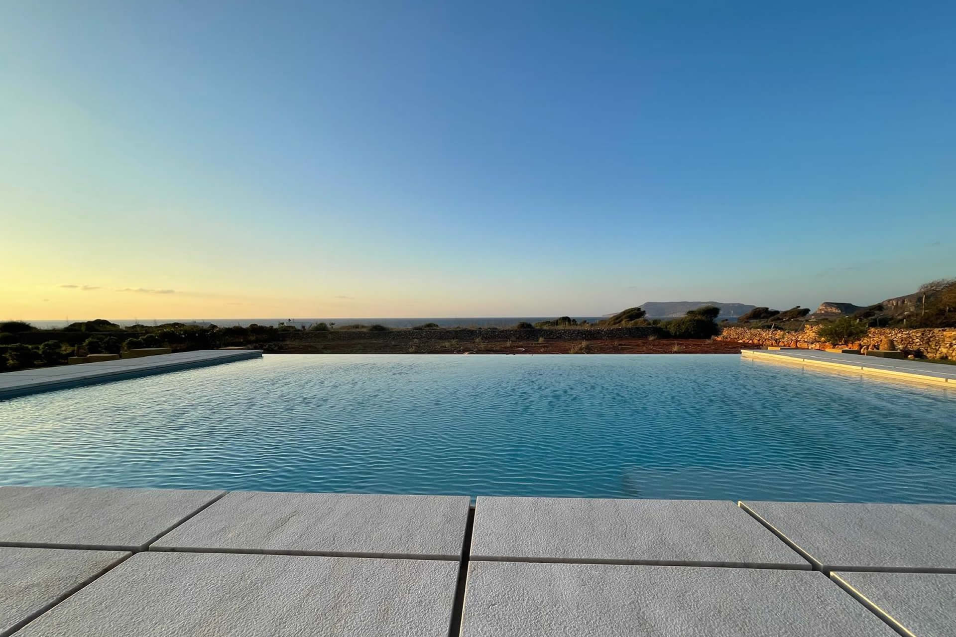 Immergetevi nel lusso e nella tranquillità della nostra ampia piscina a sfioro, perfettamente incastonata nel paesaggio e progettata per offrire una vista panoramica impareggiabile sull'incantevole isola di Levanzo, una delle meraviglie naturali dell'arcipelago delle Egadi